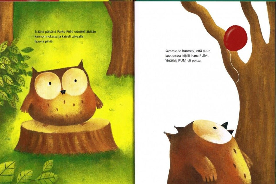 Parku-Pöllö on lohduton: sen oma PUM on poissa! Metsässä syntyy melkoinen vipinä, kun äänekkäästi parkuva pikkupöllö haluaa omansa takaisin. Pikkuhiljaa selviää, että Parku-Pöllön PUM on punainen, pyöreä ja se osaa lentää. Kun salaperäinen PUM vihdoin löytyy - PUM vain ja se on taas poissa…