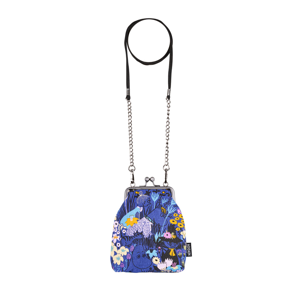 Tukevasta puuvillakankaasta valmistettu muumiaiheinen pikkulaukku. Säädettävä, osittain metallinen olkahihna (130 cm) on irrotettavissa. Laukussa on nupillinen metallilukko. Laukun metalliosat ovat mustat. Lue lisää