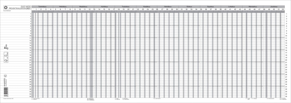 Koko 837 x 297 mm, taitettuna A4; suunnittelukalenteri, jossa koko vuosi kerralla nähtävissä; kuukaudet rinnakkain, myös viikko- ja päiväjaotus; tehtäville ja toimenpiteille rivit allekkain; Avainlippu-tuote; FSC®-sertifioitu tuote. Lue lisää