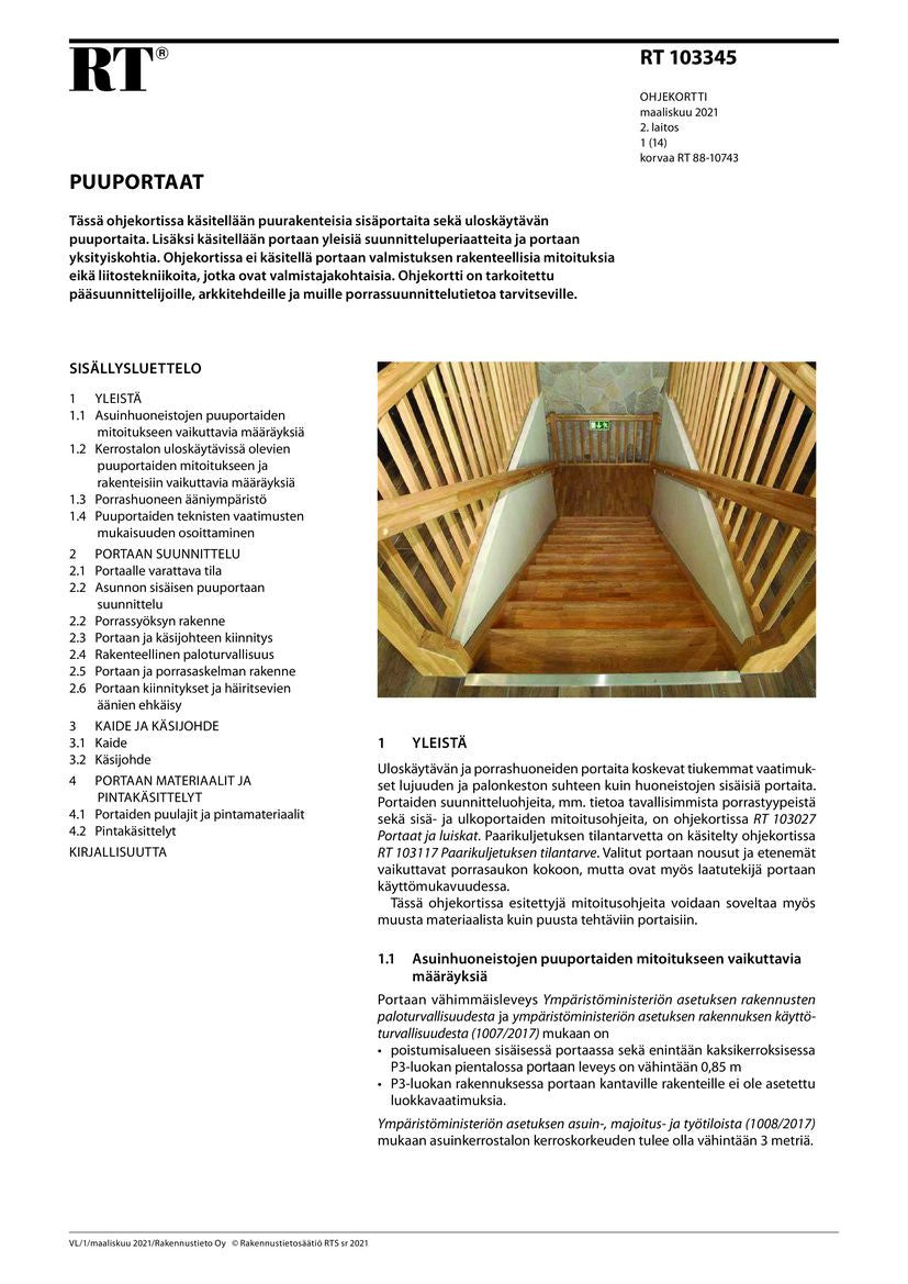 Tässä ohjekortissa käsitellään puurakenteisia sisäportaita sekä uloskäytävän puuportaita. Lisäksi käsitellään portaan yleisiä suunnitteluperiaatteita ja portaan yksityiskohtia. Ohjekortissa ei käsitellä portaan valmistuksen rakenteellisia mitoituksia eikä liitostekniikoita, jotka ovat valmistajak... Lue lisää