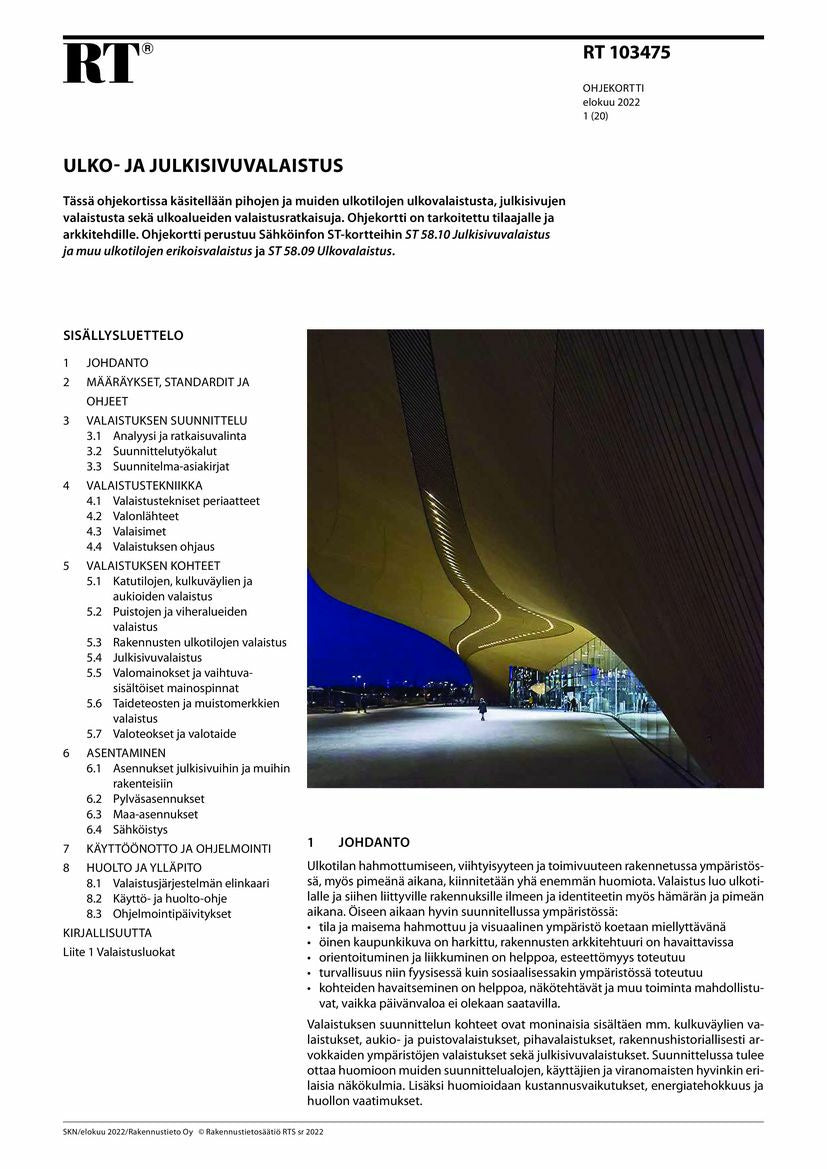 Tässä ohjekortissa käsitellään pihojen ja muiden ulkotilojen ulkovalaistusta, julkisivujen valaistusta sekä ulkoalueiden valaistusratkaisuja. Ohjekortti on tarkoitettu tilaajalle ja arkkitehdille. Ohjekortti perustuu Sähköinfon ST-kortteihin ST 58.10 Julkisivuvalaistus ja muu ulkotilojen erikoisv... Lue lisää