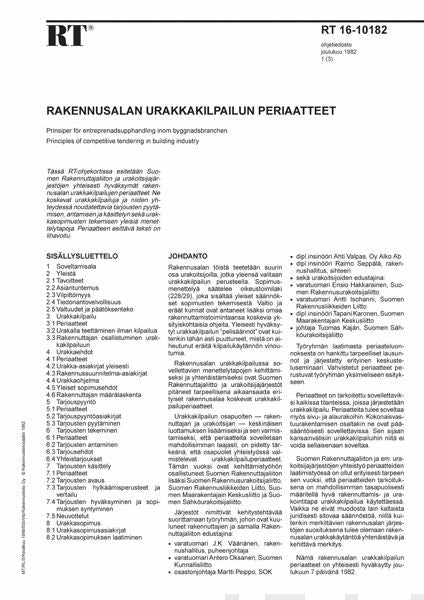 RT-ohjeessa esitetään Suomen Rakennuttajaliiton ja urakoitsijajärjestöjen yhteisesti hyväksymät rakennusalan urakkakilpailujen periaatteet. Ne koskevat urakkakilpailuja ja niiden yhteydessä noudatettavia tarjousten pyytämisen, antamisen ja käsittelyn sekä urakkasopimusten tekemisen yleisiä menett... Lue lisää