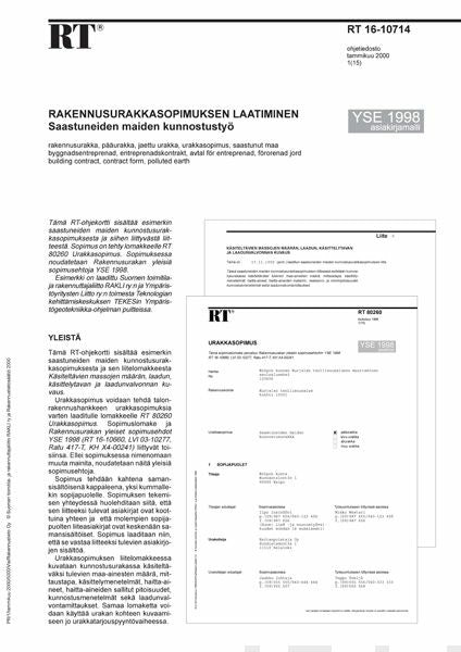 RT 16-10714, Rakennusurakkasopimuksen laatiminen. Saastuneiden maiden kunnostustyö. (YSE 1998 asiakirjamalli)