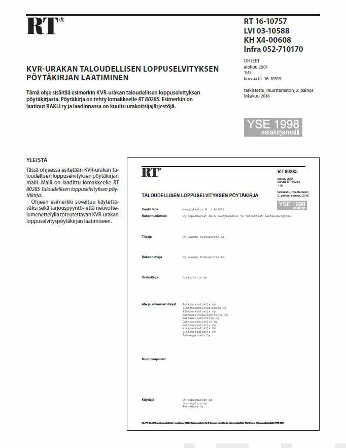 RT 16-10757, KVR-urakan taloudellisen loppuselvityksen pöytäkirjan laatiminen. (YSE 1998 asiakirjamalli)