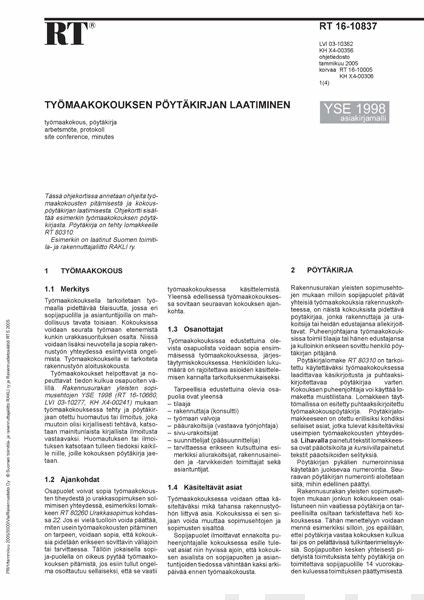 RT-ohjeet työmaakokousten pitämiseen ja kokouspöytäkirjan laatimiseen. Ohje sisältää esimerkin työmaakokouksen pöytäkirjasta. Pöytäkirja on tehty lomakkeelle RT 80310. Esimerkin on laatinut Suomen toimitila- ja rakennuttajaliitto RAKLI ry.