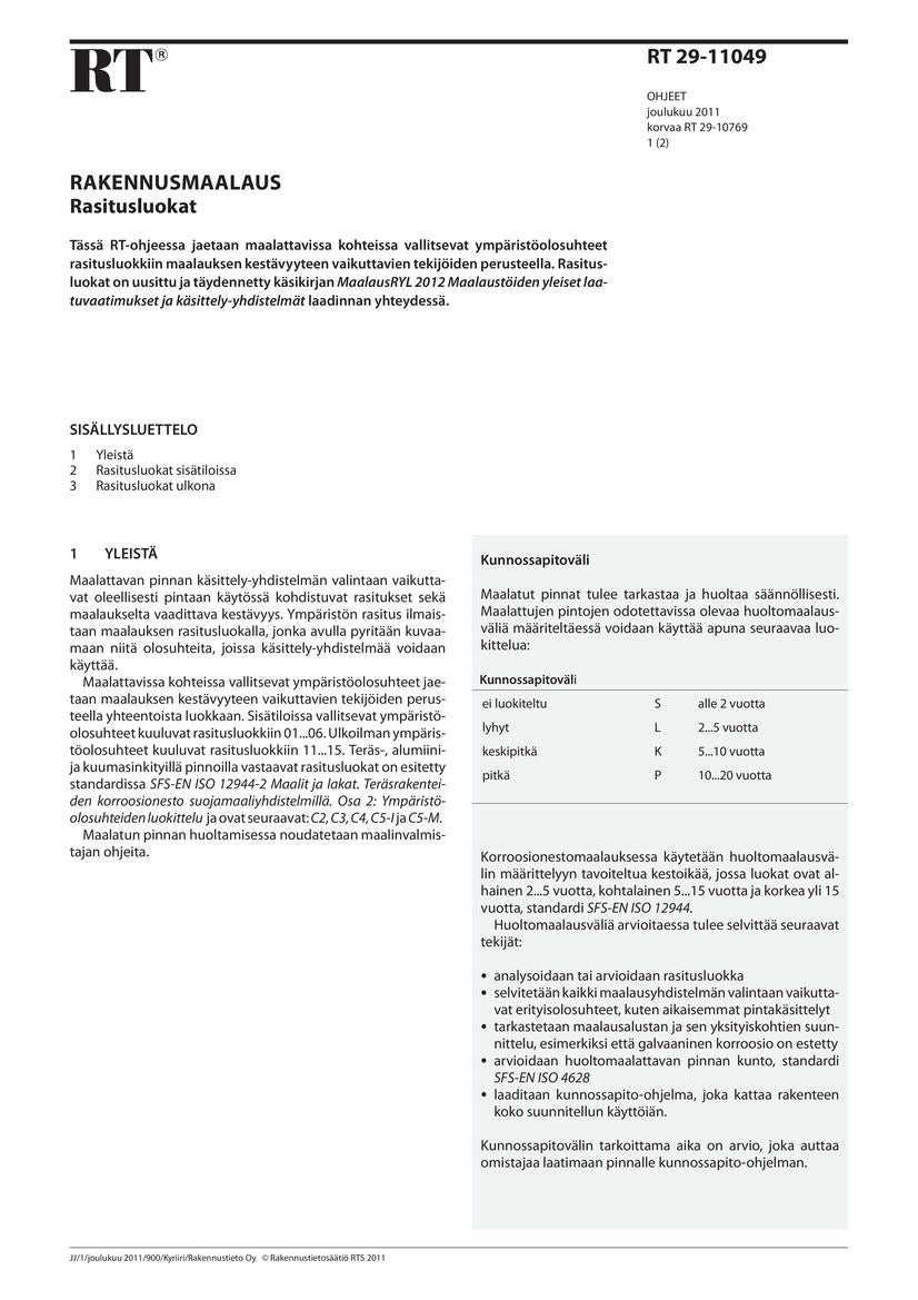 - Avainsanat julkisivumaalaus; maalaus; maalauskorjaus; maalipinnat; maalaustyö; rakennusmaalaus; kunnossapito; julkisivut; ulkoseinät; seinät; sisäpinnat; sisäseinät; seinäpinnat; huoltovälit; ilmastorasitukset; kunnossapitojaksot; rasitusluokat; ulkomaalaus; ympäristöolosuhteet; ympäristörasitusluokat