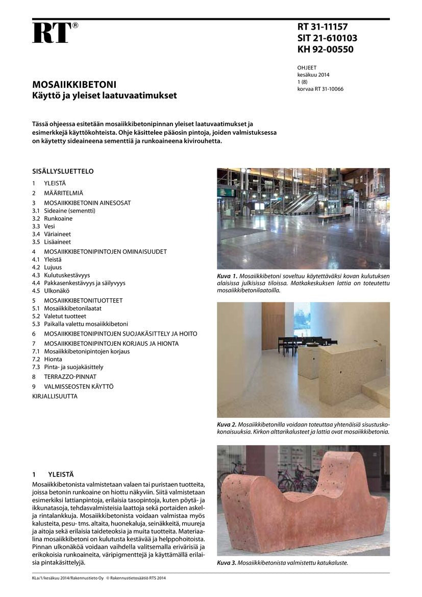 RT-ohjeessa esitetään mosaiikkibetonipinnan yleiset laatuvaatimukset ja esimerkkejä käyttökohteista. Ohje käsittelee pääosin pintoja, joiden valmistuksessa on käytetty sideaineena sementtiä ja runkoaineena kivirouhetta.