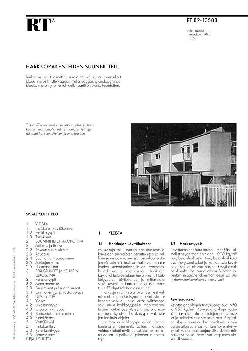 RT-ohjeessa esitetään ohjeita harkoista muuraamalla tai liimaamalla tehtyjen rakenteiden suunnitteluun ja mitoitukseen. Ohjeessa käydään läpi mm. harkkojen käyttökohteet, harkkotyypit, muurauslaastit ja liimat, muuraussiteet ja raudoitteet, mitoitus ja limitys, rakenteellisia ohjeita, raudoitus, saumat ja muuraaminen, aukkojen ylitys, liikuntasaumat, perustustyypit, matalaperustus, perusmuurit ja kellarin seinät sekä niiden raudoitus ja pintakäsittely ja kosteuseristys. Lisäksi tarkastellaan lämmöneristys ja routasuojaus, ulkoseinätyypit, niiden lujuusominaisuudet, kosteustekninen toiminta ja pintakäsittely, väliseinien pintakäsittely, palonkestävyys ja ääneneristys.