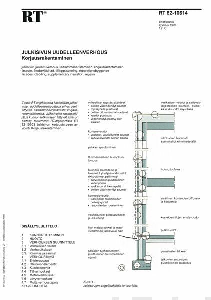 RT-ohjeessa käsitellään julkisivujen uudelleenverhousta ja siihen usein liittyvää lisälämmöneristämistä korjausrakentamisessa. Ohjeessa käsitellään mm. kunnon tutkiminen, huolto, verhouksen suunnittelu, verhouksen valinta, vanha ulkokuori, kiinnitys ja saumat, verhoustavat, eristerappaus, ohutkuorielementit, kuorielementit, tiiliverhoukset, metalliverhoukset, levyverhoukset sekä muita verhoustapoja. Julkisivujen rasitustekijät ja kunnon tutkimiseen liittyvät asiat on esitetty tarkemmin RT-ohjeessa RT 82-10603 Julkisivun korjaustarpeen arviointi. Korjausrakentaminen.