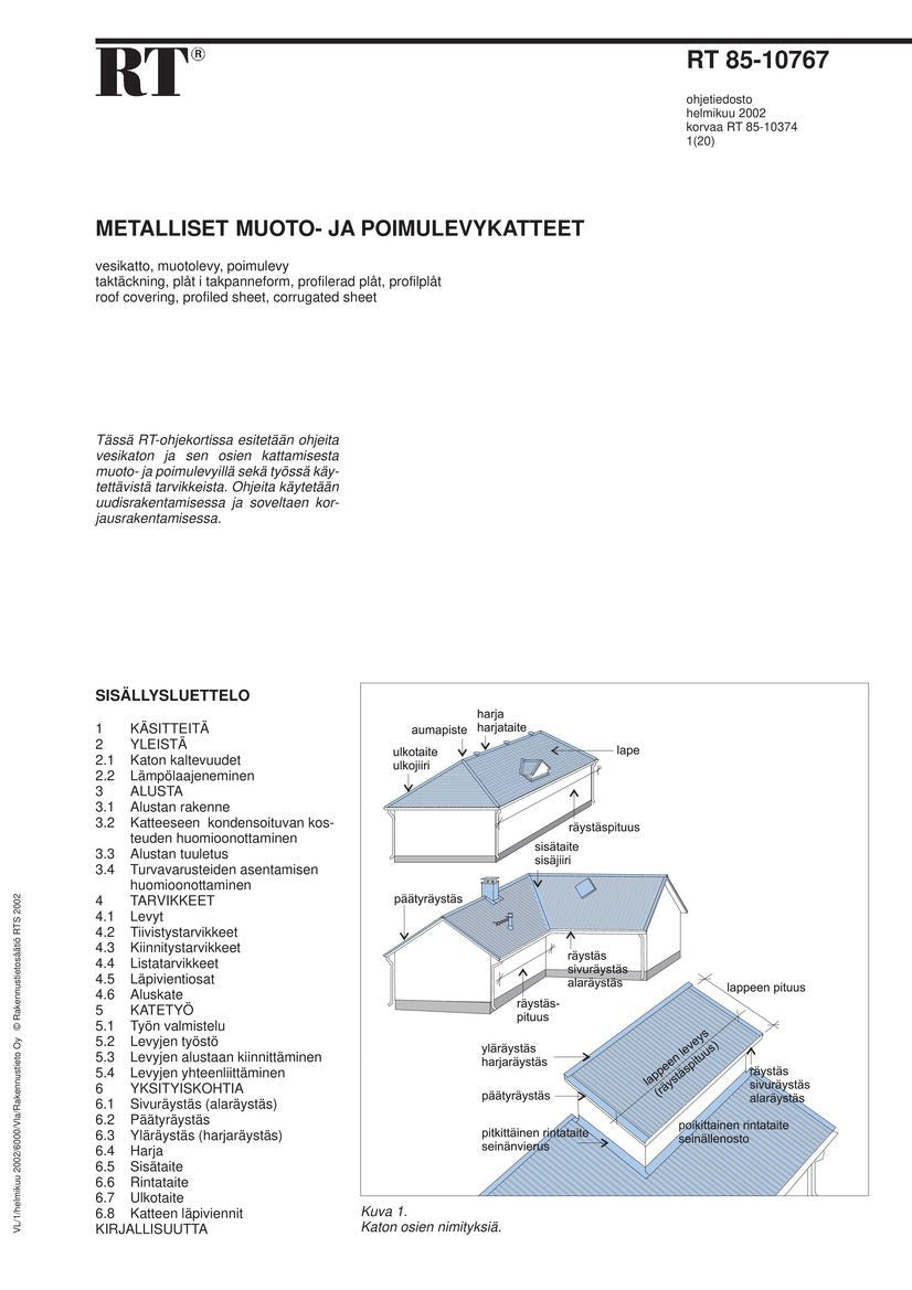 RT-ohjeita vesikaton ja sen osien kattamisesta muotolevyillä ja poimulevyillä sekä työssä käytettävistä tarvikkeista. Ohjeita käytetään uudisrakentamisessa ja soveltaen korjausrakentamisessa.