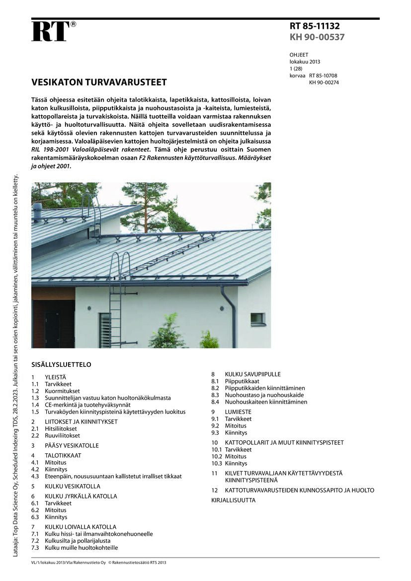 Tässä ohjeessa esitetään ohjeita talotikkaista, lapetikkaista, kattosilloista, loivan katon kulkusilloista, piipputikkaista ja nuohoustasoista ja -kaiteista, lumiesteistä, kattopollareista ja turvakiskoista. Näillä tuotteilla voidaan varmistaa rakennuksen käyttö- ja huoltoturvallisuutta. Näitä oh... Lue lisää