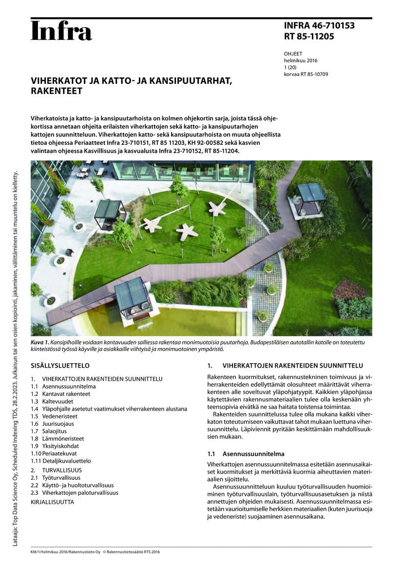 - Avainsanat viherkasvit; kasvit; puut; puutarhat; perennat; kattorakenteet; vesikatot; vesikattorakenteet; kattotyöt; bitumikatteet; bitumikermit; vedeneristys; vesikatteet; pensaat; kasvillisuus; viherrakentaminen; viherrakenteet; vedeneristeet; kaltevuus; kansirakenteet; kattokaivot; kattopuutarhat; pihakannet; viherkatot; viherkattotarvikkeet