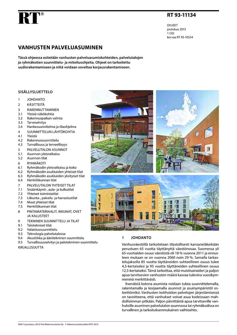 RT-ohjeessa esitetään vanhusten palvelutalojen ja ryhmäkotien suunnittelu- ja mitoitusperusteita sekä esimerkkejä tyypillisistä makuuhuoneista, oleskelutiloista ruokailutiloista, keittiötiloista, pesutiloista ja wc-tiloista. Lisäksi ohje sisältää ohjeita ja esimerkkejä palvelutalojen yhteistiloista, kuten oleskelutiloista, liikuntatiloista vaatehuoltotiloista, varastotiloista ja kulkutiloista. Myös rakennuksen kalusteisiin ja varusteisiin kiinnitetään huomiota. Ohjeet on tarkoitettu ensisijaisesti uudisrakentamiseen, mutta niitä voidaan käyttää korjausrakentamiseen soveltuvin osin. Palveluasunnon tulee soveltua myös asukkaalle, joka on joko liikkumisesteinen, viettää asunnossa huomattavan osan ajastaan, on usein vuoteen omana tai tarvitsee toisen henkilön apua.