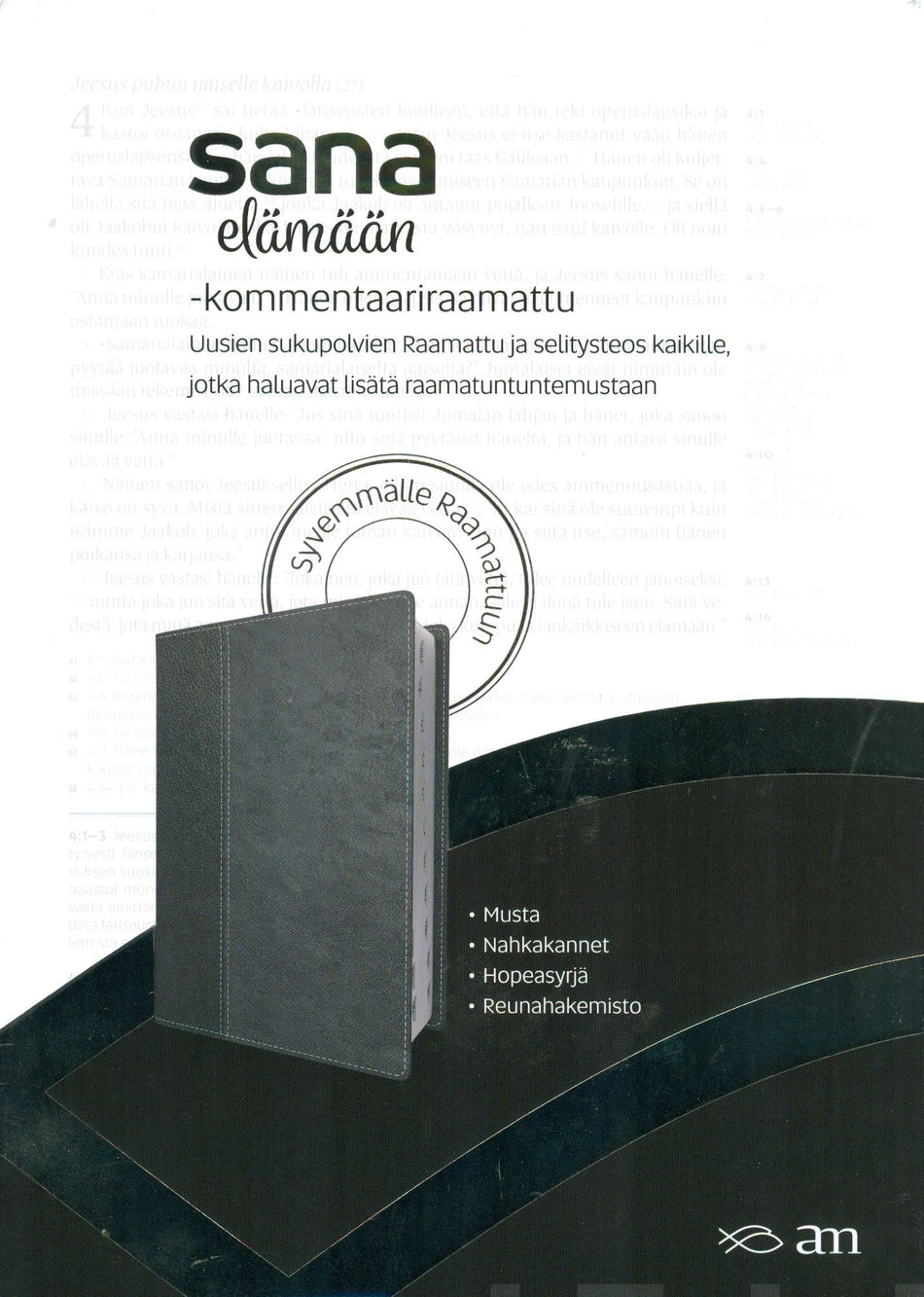 Sukella syvemmälle Raamattuun! Sana elämään -kommentaariraamattu on uusien sukupolvien Raamattu ja selitysteos kaikille, jotka haluavat syventää raamatuntuntemustaan. Teos perustuu Raamattu Kansalle -käännökseen, joka on ainoa 2000-luvulla julkaistu kokonainen suomenkielinen raamatunkäännös.