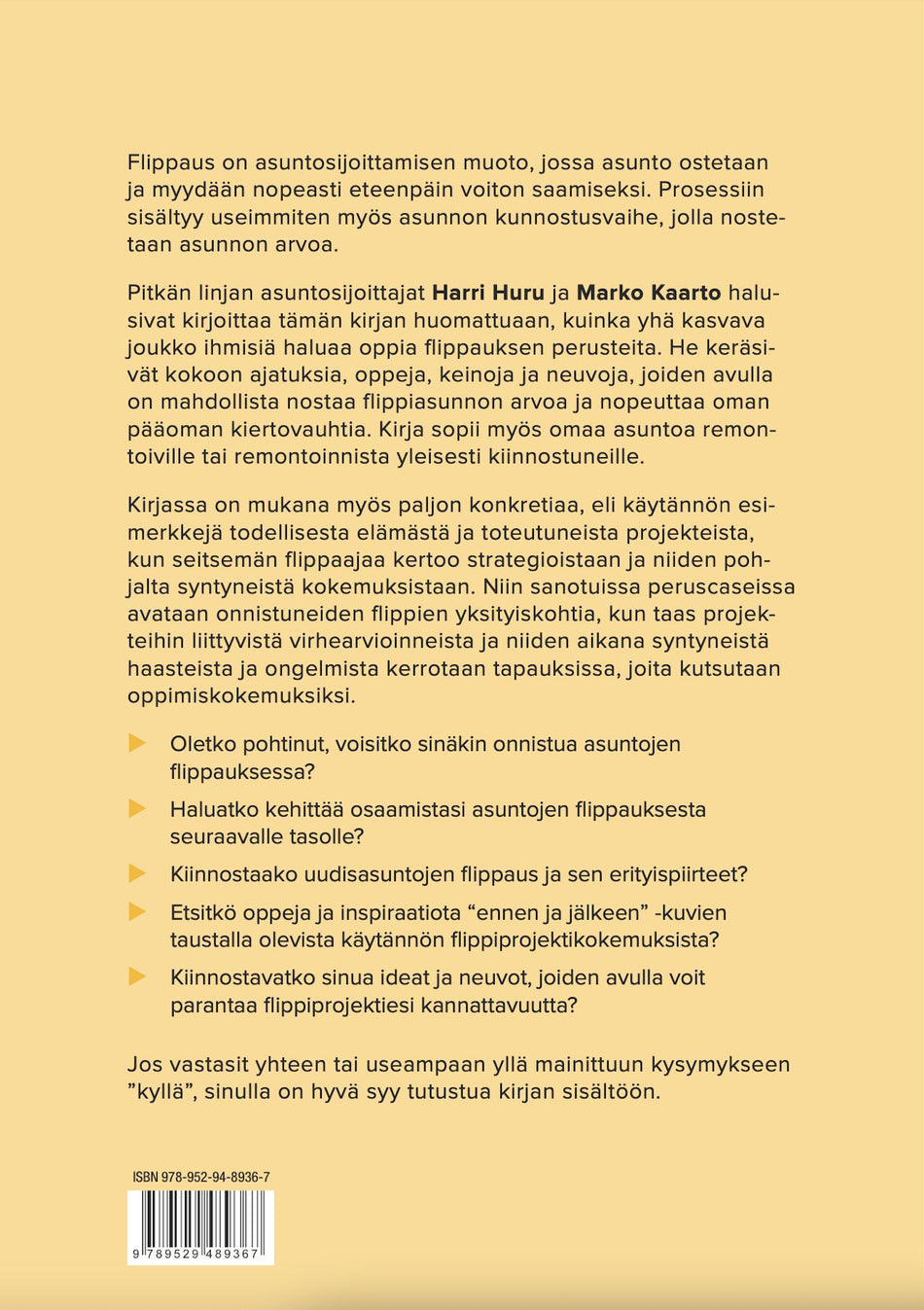 Pitkän linjan asuntosijoittajat Harri Huru ja Marko Kaarto halusivat kirjoittaa tämän kirjan huomattuaan, kuinka yhä kasvava joukko ihmisiä haluaa oppia flippauksen perusteita. He keräsivät kokoon ajatuksia, oppeja, keinoja ja neuvoja, joiden avulla on mahdollista nostaa flippiasunnon arvoa ja nopeuttaa oman pääoman kiertovauhtia. Kirja sopii myös omaa asuntoa remontoiville tai remontoinnista yleisesti kiinnostuneille.