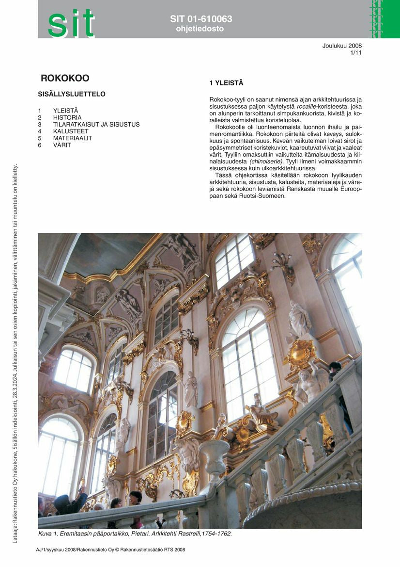 Tässä ohjekortissa käsitellään rokokoon tyylikauden arkkitehtuuria, sisustusta, kalusteita, materiaaleja ja värejä. Kortissa on lyhyt historiallinen katsaus rokokoon leviämisestä Ranskasta muualle Eurooppaan ja Ruotsi-Suomeen.