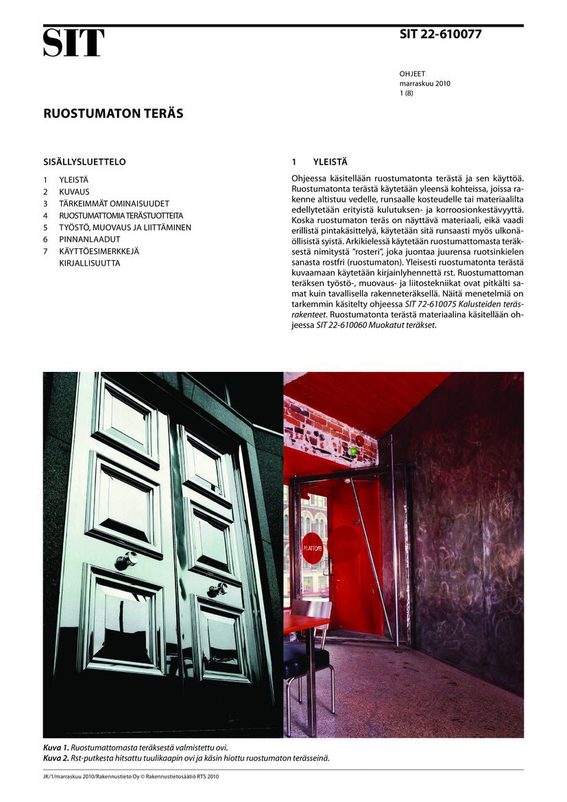 Ohjeessa käsitellään ruostumatonta terästä ja sen käyttöä. Ruostumatonta terästä käytetään yleensä kohteissa, joissa rakenne altistuu vedelle, runsaalle kosteudelle tai materiaalilta edellytetään erityistä kulutuksen- ja korroosionkestävyyttä. Lue lisää