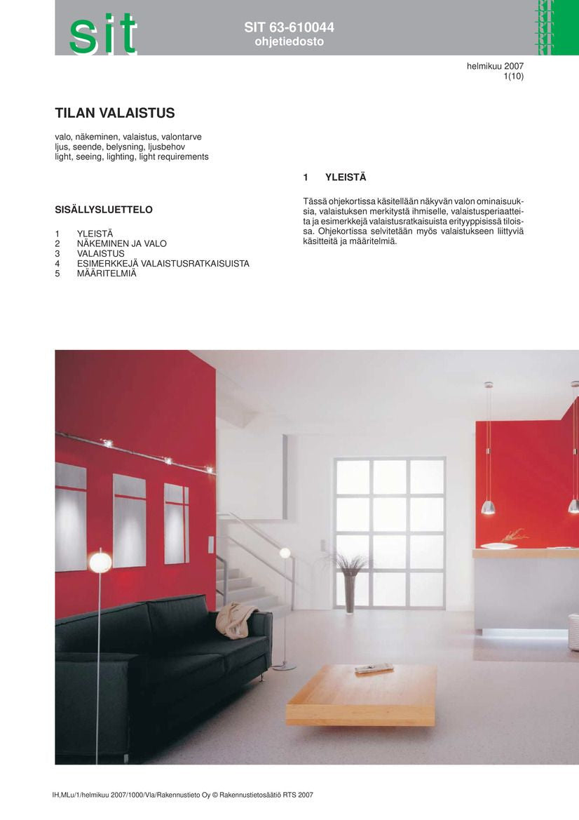 - Avainsanat kahvilat; ravintolat; asunnot; toimistotilat; työtilat; hallintotilat; sisävalaistus; valo; koulutustilat; luminanssi; opetustilat; valaistus; ravitsemisliikkeet; auditoriot; näkeminen; näkökenttä; näyttelytilat; näyttöpäätetyöskentely; valaistusvoimakkuus; valon aallonpituus; valon väri; valontarve; värintoistoindeksi