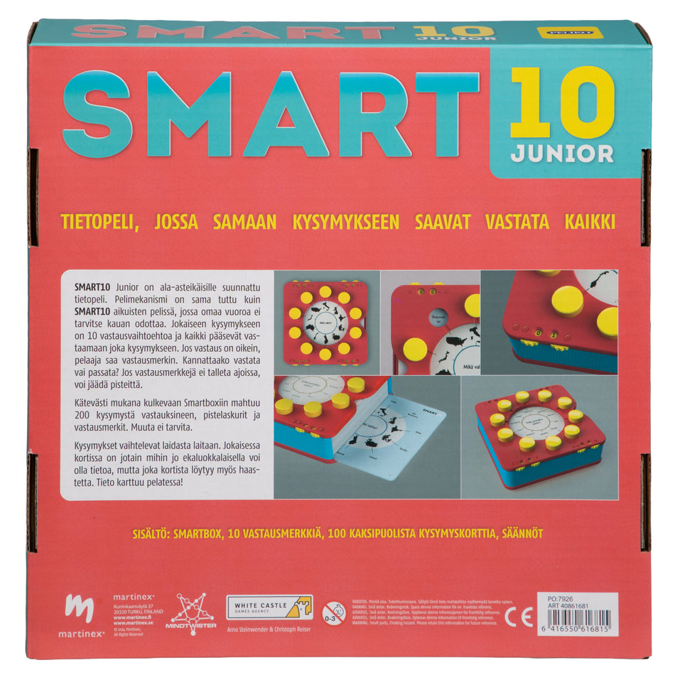 Smart10 junior on mainio lautapeli koko perheelle. Vaikka kysymykset on suunnattu lapsille ja nuorille, löytyy niistä paikoin haastetta myös aikuisille.