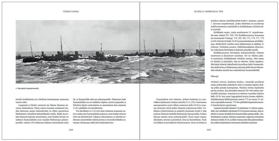 Itämeren pohjassa lepäävien hylkyjen tarinat aukeavat upeiden vedenalaisten kuvien äärellä ja ensimmäisen maailmansodan aikaiset arkistokuvat laivoista, sukellusveneistä ja henkilöistä havainnollistavat historiallisia hetkiä.