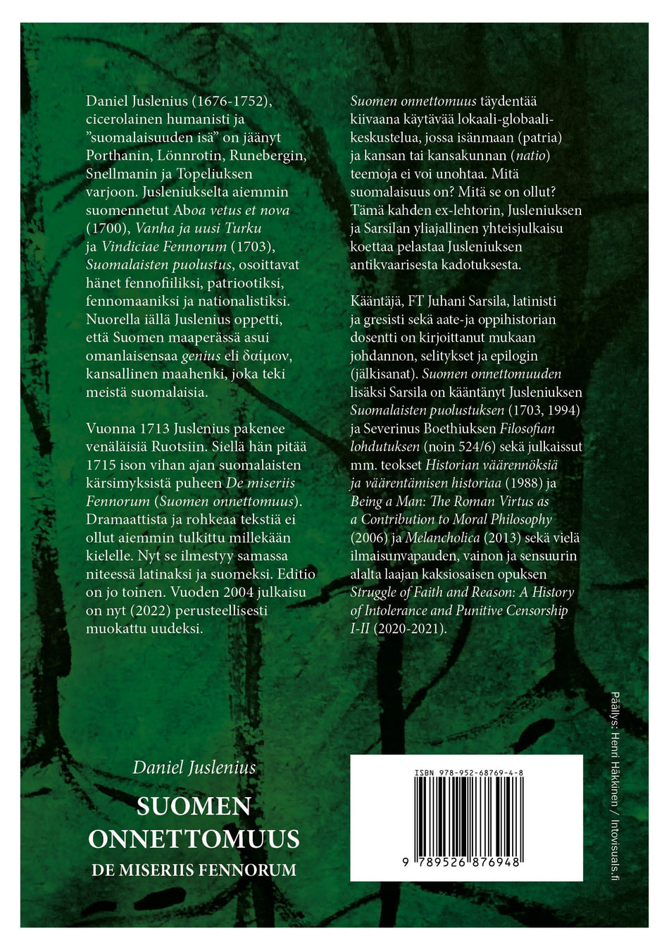Suomen onnettomuus täydentää kiivaana käytävää lokaali-globaali-keskustelua, jossa isänmaan (patria) ja kansan tai kansakunnan (nation) teemoja ei voi unohtaa. Mitä suomalaisuus on? Mitä se on ollut? Tämä kahden ex-lehtorin, Jusleniuksen ja Sarsilan yliajallinen yhteisjulkaisu koettaa pelastaa Jusleniuksen antikvaarisesta kadotuksesta.