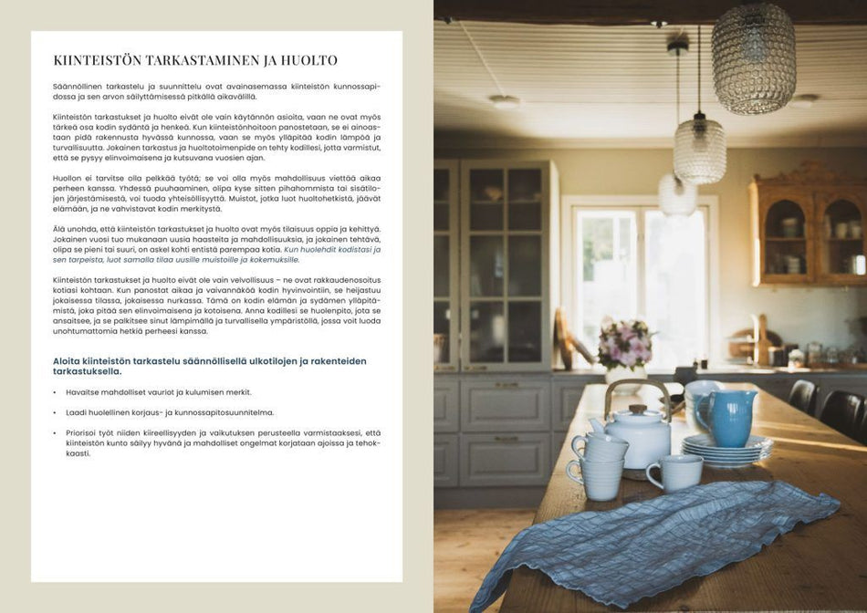 Talon huoltokirja on suunniteltu sinulle, joka haluat säilyttää kaikki tärkeät tiedot, muistot ja huomiot kodistasi kätevästi yhdessä paikassa. Se auttaa sinua dokumentoimaan kodin suunnitteluprosessin, historian, remontit sekä unelmat tulevaisuudesta - samalla kun pysyt ajan tasalla kodin huollosta ja kunnossapidosta.