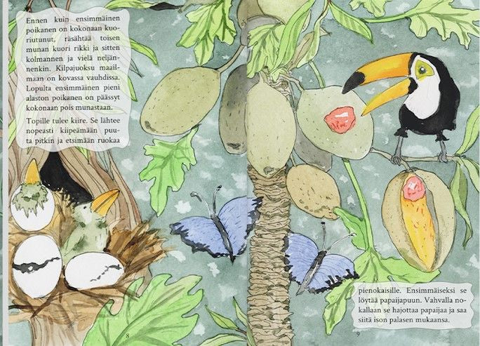 Tea Tukaanin matkassa pääset tutustumaan tukaanien elämään viidakossa. Kuka hautoo tukaaniperheenmunat? Kenen vastuulla on poikasten hoito? Minkälaisia vaaroja viidakossa vaanii? Näihin kysymyksiin löydät vastauksen kirjan sivuilta. Ja mikä parasta, tämä tarina voisi ihan oikeasti olla tottakin! Lue lisää