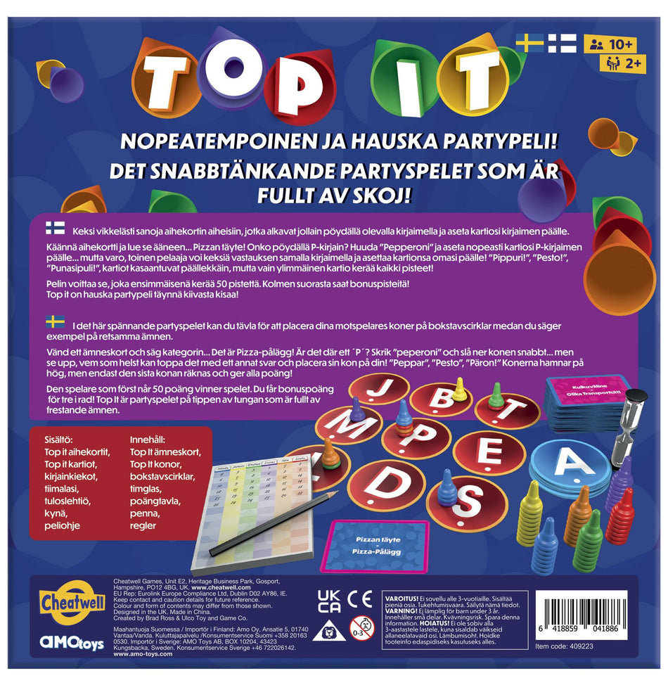 Hauska partypeli, jossa mukana tiimalasi. Keksi oikeat vastaukset korttien aiheisiin ja yritä saada kartiosi päällimmäiseksi. 2 tai useampia pelaajia. Lue lisää