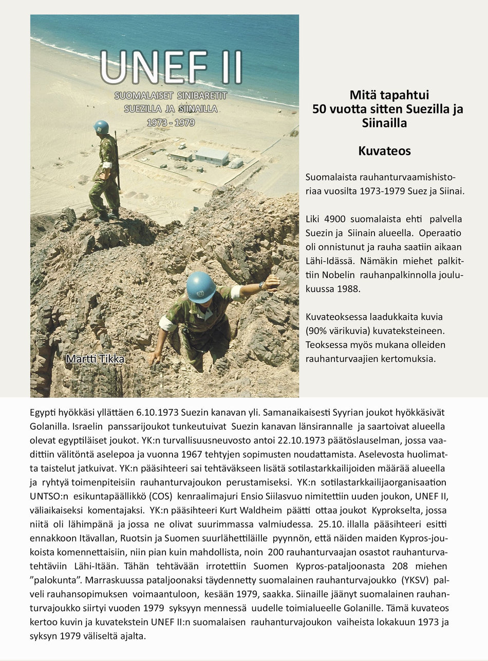 Tämä kuvateos kertoo kuvin ja kuvatekstein UNEF II:n suomalaisen rauhanturvajoukon vaiheista lokakuun 1973 ja syksyn 1979 väliseltä ajalta.