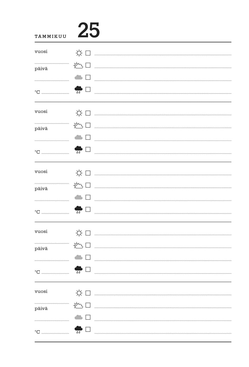 Viiden vuoden päiväkirjaan kokoat kätevästi niin tärkeät tapahtumat, säätiedot kuin muutkin havainnot. Päiväkirjassa on yksi sivu jokaiselle vuoden päivälle. Tyylikäs päiväkirja on 100 % kotimaista tuotantoa.