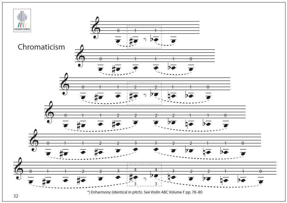 Colourstrings Violin ABC Books E (9790550095434) and F (9790550095441) have relevant chapters about finger patterns and enharmony and our recommended to use alongside with the Violin Scales 2.