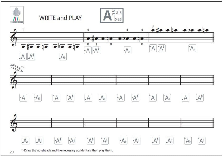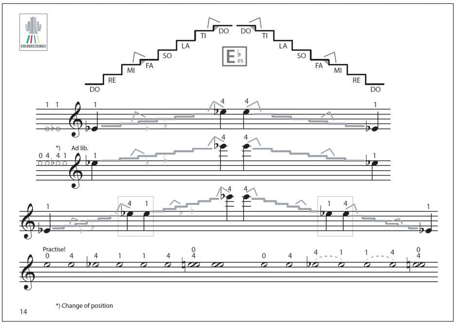 To facilitate the learning, each page will introduce only one new note. The initial tone of each scale is properly printed; the places of other tones are illustrated with a diagram. This helps the child to concentrate on the learning and writing of the new note and its locating on the fingerboard.