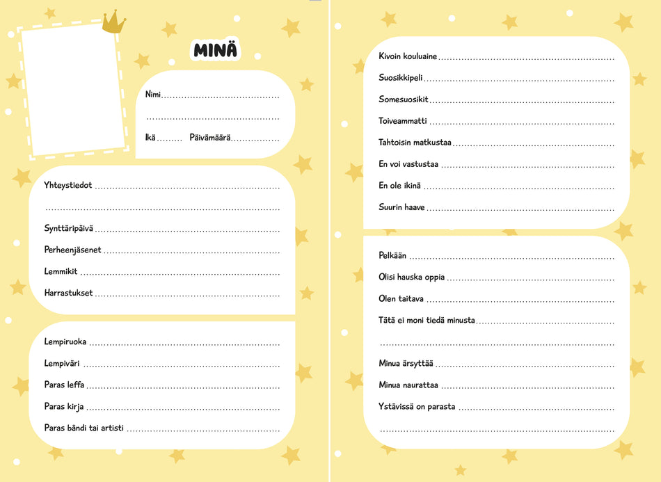 Mikä on ystävän lempiväri, miksi hän aikoo tulla isona ja muita tärkeitä kysymyksiä täytettäväksi ja säästettäväksi.